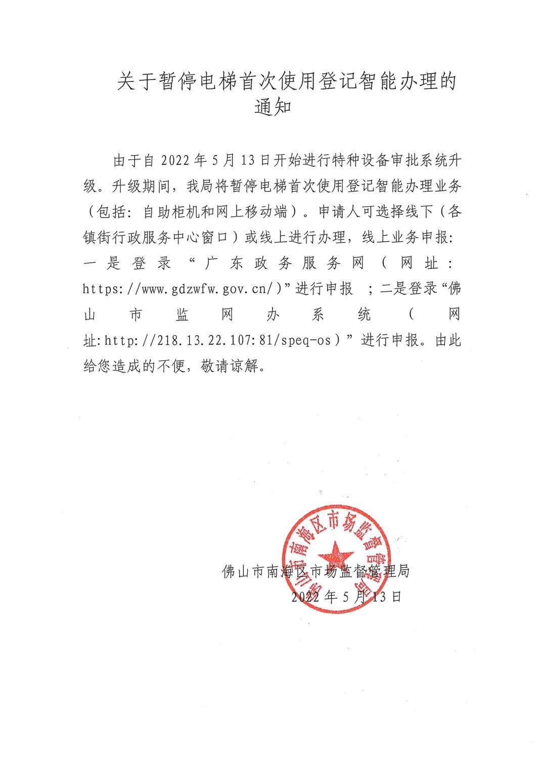 由于自2022年5月13日开始进行特种设备审批系统升级。升级期间,我局将暂停电梯首次使用登记智能办理业务(包括∶自助柜机和网上移动端)。申请人可选择线下(各镇街行政服务中心窗口)或线上进行办理,线上业务申报∶一是登录“广东政务服网(网址∶https://www.gdzwfw.gov.cn/)”进行申报;二是登录“佛山市市监网办系统(网址∶http://218.13.22.107∶81/speq-os)”进行申报。由此给您造成的不便,敬请谅解。