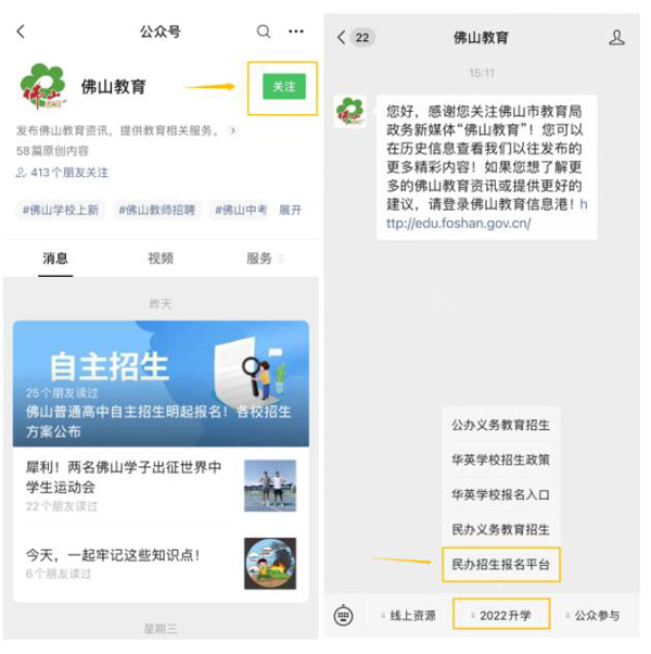 关注“佛山教育”微信公众号,点击菜单栏【2022升学】-【民办招生报名平台】即可进入。