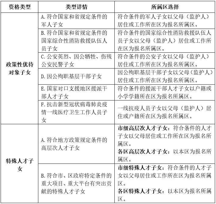 政策性优待对象子女、特殊人才子女在报名同时填报2-3所所在区学校志愿。