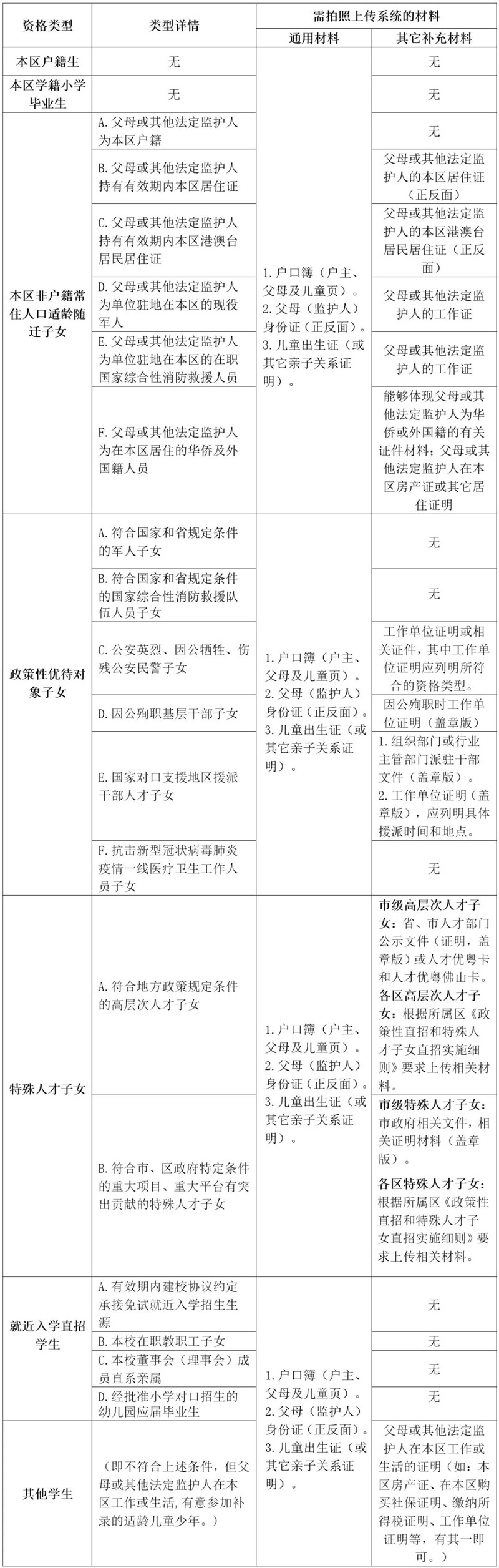 所有报名学生需在市招生平台填写学生基本信息(姓名、证件类型、证件号码等)、报名身份(包括所属区、所属镇街、资格类型、监护人各项信息等),并根据资格类型将相关证件拍照上传。