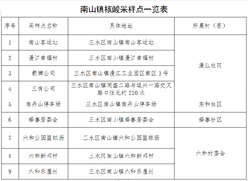 因周边地区新冠疫情变化,为进一步强化疫情防控管控措施,按照市、区统一安排,定于2022年5月18日8:30-16:00在三水区南山镇范围内开展区域核酸检测工作(检测地点附后)。现将有关事项通告如下: