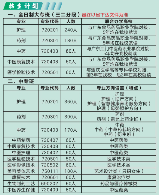 2.药剂、护理、中药、中医康复技术、医学检验5个专业可以报三二分段(最终以省下达文件为准),只招初中应届毕业生,按照中考志愿和成绩择优录取:报了三二分段的同学,如不能被录取,转到相应专业的中专班。