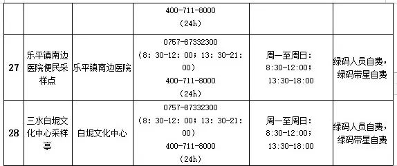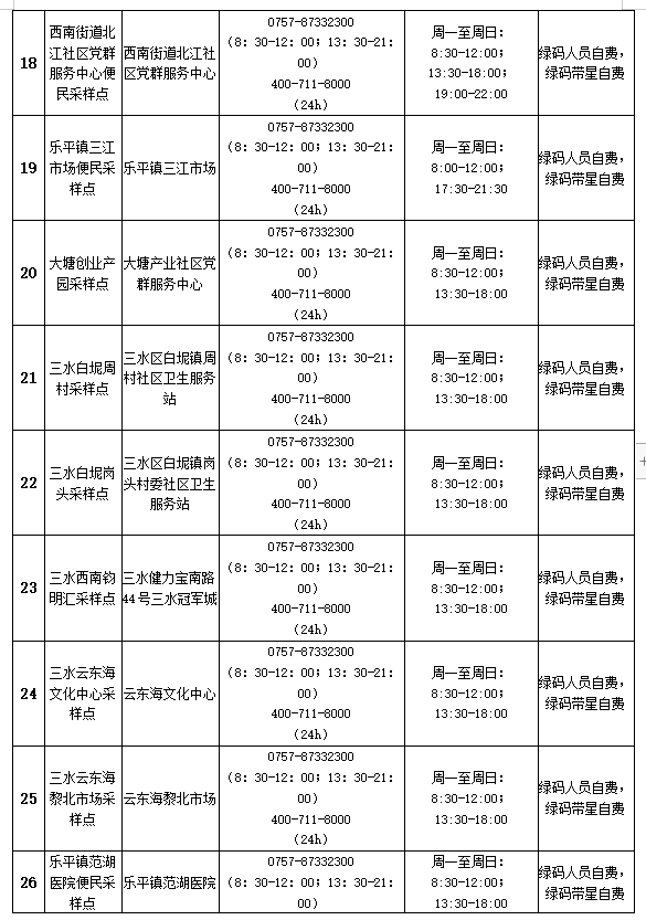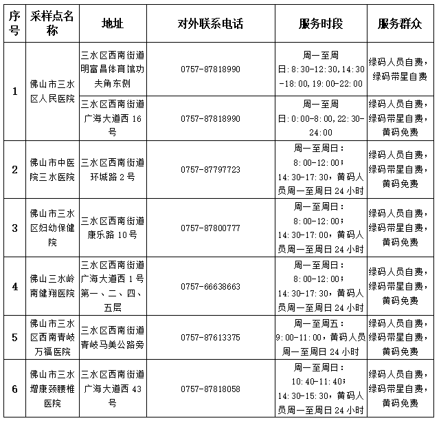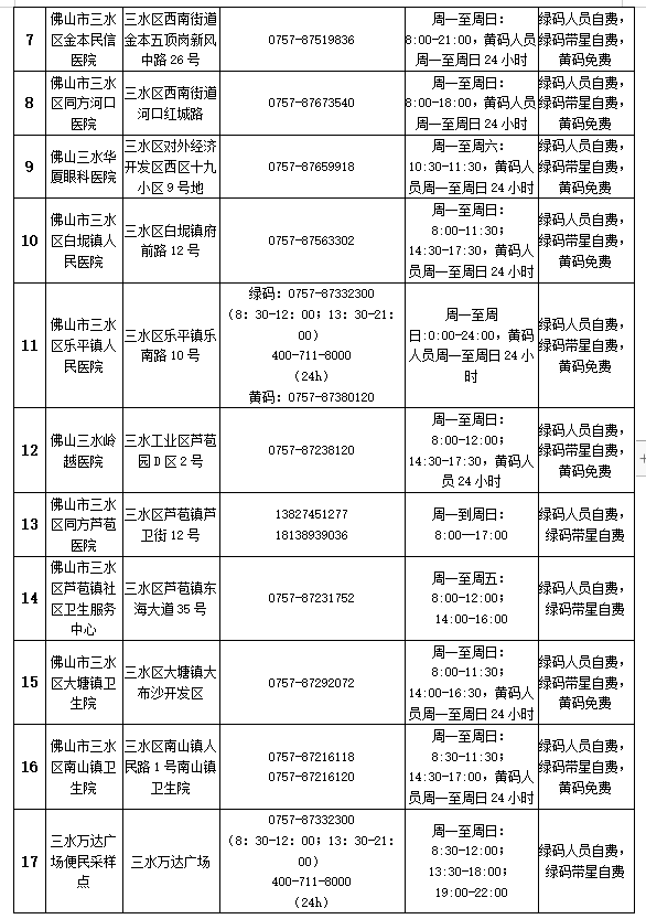 5月24日起,三水区调整部分便民核酸检测采样点服务。请有核酸检测需求的群众,就近到开放核酸检测服务的机构进行检测。开放核酸检测服务的机构详见下表: