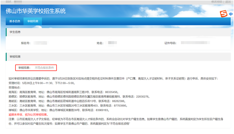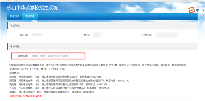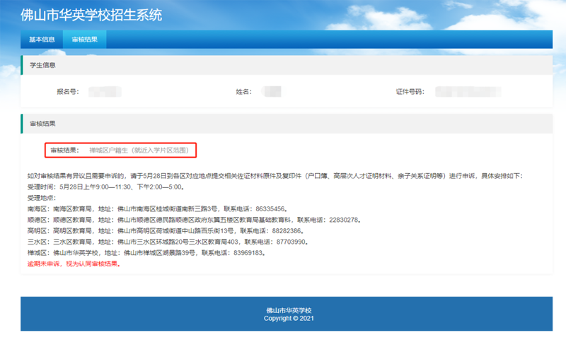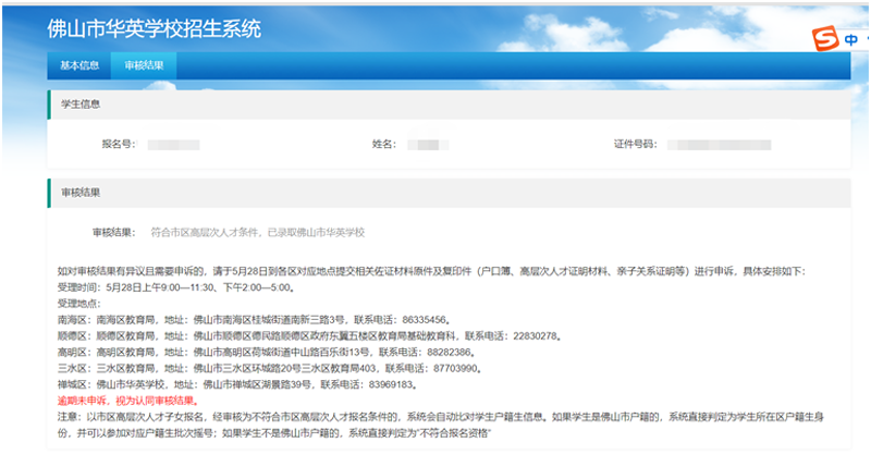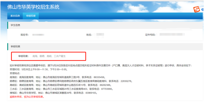 市民可登录“佛山市华英学校招生系统”;网址:https://cczs.fsccjy.com/huaying/查询审核结果。