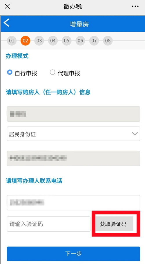 06、输入购房人信息,获取【验证码】(目前只能自行申报,无法代理申报)