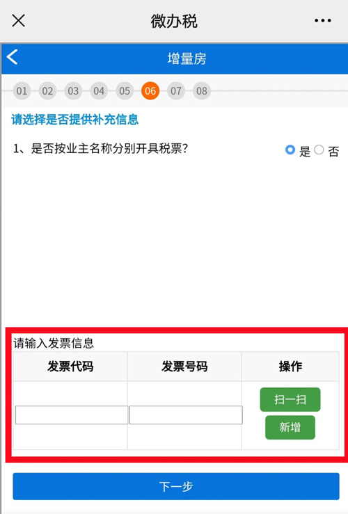 10、点击【扫一扫】扫描发票代码和号码;如未有购房发票,发票代码输入:111111(6个1),发票号码输入:11111111(8个1)。
