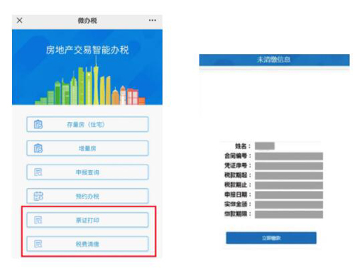 12、税务人员审核受理完成后将短信通知审核结果,纳税人收到12366短信后可进入【广东税务】微信公众号——【房地产交易智能办税】——【税费清缴】进行在线缴纳税款(可选择微信支付、支付宝等),并在【票证打印】选择自行打印电子税票或者选择邮寄税票。
