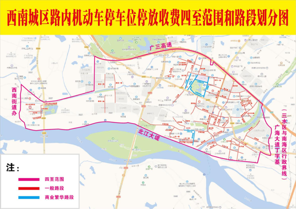 根据三水区发展规划和统计局三发统价【2017】36号文件规定,西南路内停车收费按照商业繁华路段(A类)和一般路段(B类)的分类,及日夜停车时段进行区别收费。