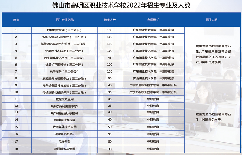 招生对象∶以佛山市应届初中毕业生为主,也招少量省内各地应届初中毕业生。其中,中高职五年贯通班、5+0中职培养以及中高衔接三二分段班为广东省户籍或符合各地"中考"报名条件的外省户籍且符合广东省高考随迁子女政策的初中毕业生。
