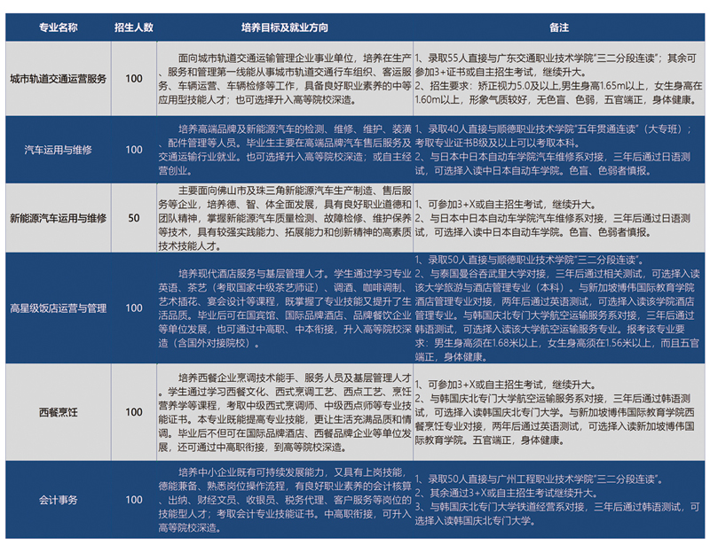 交通专业群以国家改革示范校重点专业、国家技能型紧缺人才培养培训基地专业、广东省"双精准"示范专业——汽车运用与维修专业为龙头,以新能源汽车维修、汽车营销与服务及城市轨道运营与管理3个专业为支撑,现有学生876人、专任教师29人,其中广东省特支教师1人,高级技师12名,拥有市级以上技术能手3名,省技能竞赛一等奖指导教师21名。学生技能大赛成绩显著,连续多年参加国家技能获一等奖8项、省级一等奖以上35项,省内领先18名教师获省级及国家级荣誉,双师教师比例达96%。本专业与德国巴斯夫、上汽通用、德国博世、丰田汽车、吉利汽车、佛山地铁等国内外7家著名企业合作,企业建立了深度校企合作关系,携手知名企业建立校企深度融合,把握智能化汽车技术前沿和轨道交通服务需求,采用企业订单培养、中高职贯通培养三二分段等多样化人才培养模式,培养产业急需、技能精湛、具有创新精神的交通行业高素质技术技能型人才,就业单位好,发展潜力!报读我校交通专业群选择升学的同学通过三二对接贯通培养模式可入读顺德职业技术学院和广东交通职业技术学院,也可通过中日国际交流项目到日本名古屋中日本自动车学院出国深造。