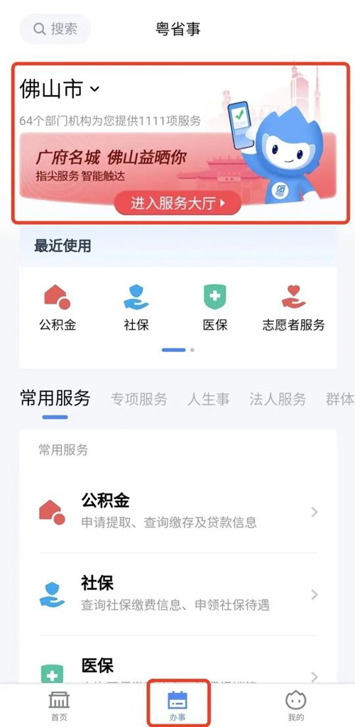 登陆“粤省事”,点击“办事”,进入“佛山益晒你”服务专区。