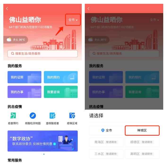 方法二:将右上角“全市”切换成“禅城区”,进入“粤省事”禅城专区。