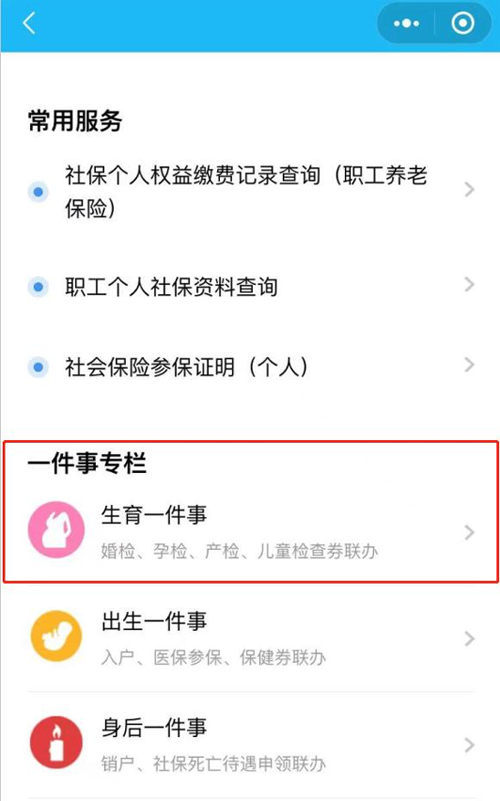 在“一件事专栏”,点击“生育一件事”,按照操作提示,即可实现生育多券联办。