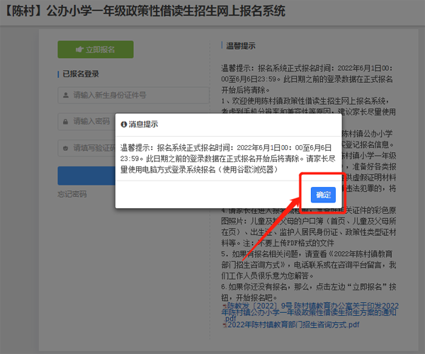 点击【立即报名】,系统弹出“2022年陈村镇公办小学一年级学位情况公布”;“2022年陈村镇教育部门招生联系电话”;“政策性借读生申请入读义务教育阶段公办学校证明材料一览表”等提示框,对信息明晰后,依次请点击【下一步】按钮。