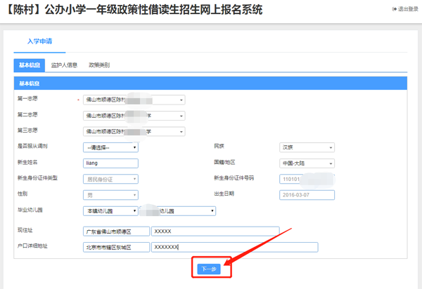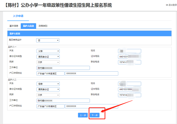 (二)监护人信息:监护人信息填写完毕并核对无误后,点击【下一步】。提示:对系统中已自动填写的监护人信息,应仔细核对。