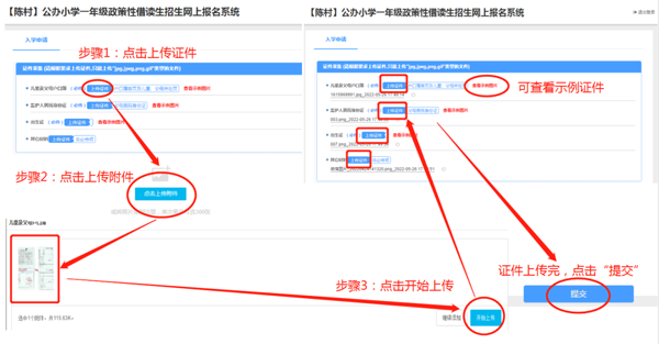 (四)证件采集:家长根据要求上传证件,上传完毕并点击【提交】就能完成报名。