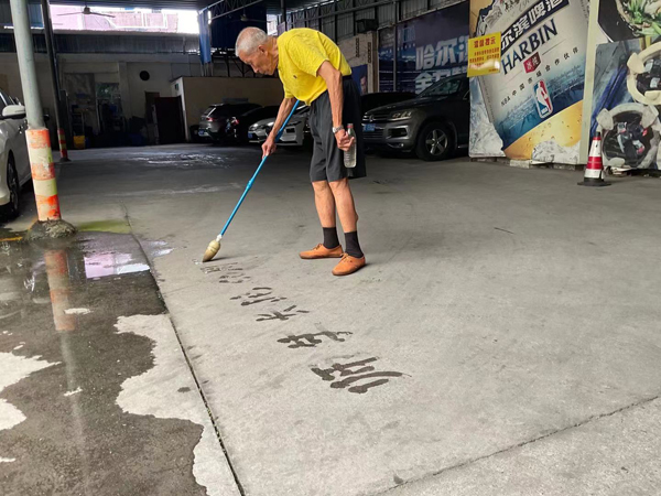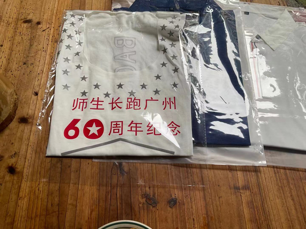今天上午师生4人由服装厂家安排假座世纪明珠酒店相聚摄影留念,共叙当年长跑的深厚情谊。年届九届的林老师即席水笔挥毫,在水泥地板写下“师生长跑广州60周年”大字。宝仕龙无缝服饰有限公司郭裕辉总经理专门为师生4人送上精心制作的长跑纪念服装和慰问金。(黄志海) 2022年6月1日