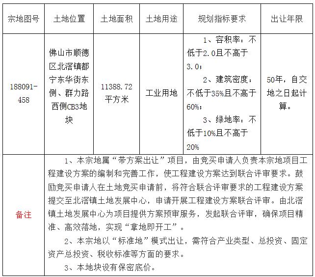 3、为促进工业建设项目“拿地即开工”审批制度改革,申请人应根据本宗地建设条件和各项管控要求,提前完成本宗地工程建设方案编制,携方案报名参与土地竞买。方案应达建筑单体方案(含规划总平面图)深度,需包括符合《佛山市自然资源局关于明确“cpi电子报批材料”制作质量要求(试行)的通知》、《佛山市城市规划管理三维互动指标核算及其电子报批系统技术规定(试行)》要求的cpi电子报批材料。