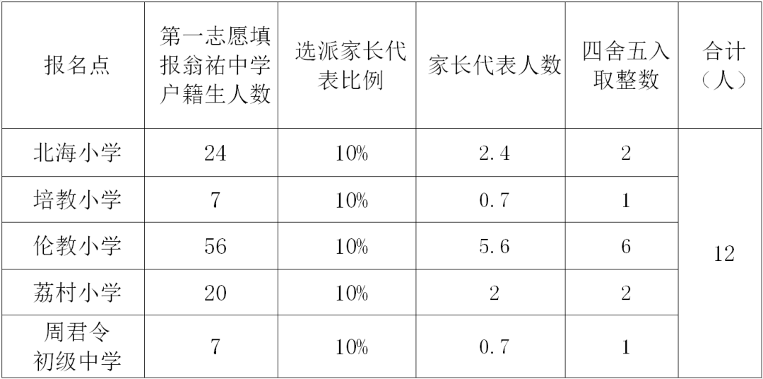 1. 以各报名点户籍生第一志愿填报翁祐中学的人数为基准,原则上按照10%的比例确定各报名点参会家长代表人数(四舍五入取整数,详见附表《家长代表人数核定表》)。