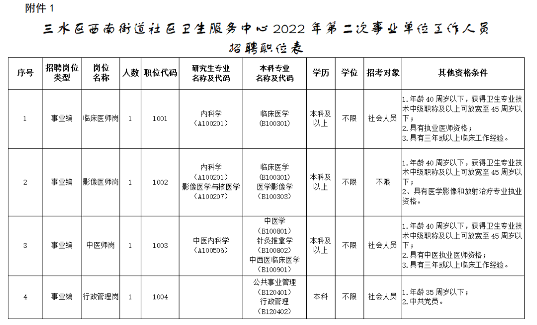 1.三水区西南街道社区卫生服务中心2022年第二次事业单位工作人员招聘职位表.doc