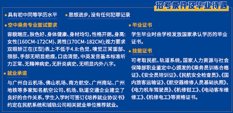 广州涉外经济职业技术学院是经广东省人民政府批准、教育部备案的省属全日制普通高职院校(设有中职部)具有23年的办学历史。学院坚持校企合作,采取"学历教育+职业技能+特色管理"的人才培养模式,重培训、重就业,形成了强化素质、注重职教、训练技能、规范鲜明的办学特色。学院建有退役飞机、发动机、形体房、化妆间、安检系统、航空城轨模拟舱、城市轨道交通运营沙盘、航空器维修基本技能操作实训室、机车转向架、受电弓、车门系统实训室等特色专业设备实训室。历经多年已成为各大航空公司、城轨公司和机场生源选拨的人才摇篮。