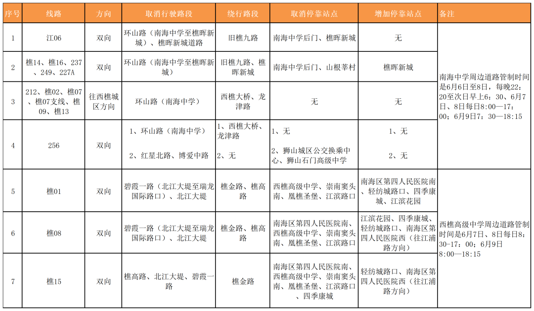 因6月7日-9日高考期间考场周边道路实施临时交通管制措施 ,公交线路需临时调整,具体方案如下∶