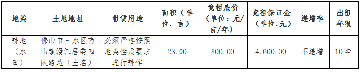 为充分盘活南山镇的公有资产及满足社会租赁需求,现我公司定于2022年6月15日(星期三)上午10:00在佛山市三水区南山镇公共资源交易所(201室),对位于佛山市三水区南山镇漫江居委四队路边(土名)的国有农用土地进行公开竞租。根据《佛山市三水区南山镇迳口片国有农用土地租赁管理规定(修订)》(南府发〔2021〕1号)文件的相关规定,现将有关事项公告如下: