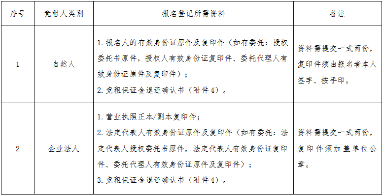 (1)自然人:竞租人需携带本人有效身份证原件(若授权委托他人参加竞租的,委托代理人须提交授权委托书原件、授权人身份证复印件、委托代理人身份证原件及复印件,且所有复印件资料一式两份,复印资料须由证件持有人签名并加盖指纹)及竞租保证金汇款或转账凭证单据原件给南山镇公共资源交易所核查。