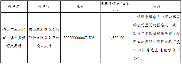 2、竞租保证金缴纳:经镇公投公司审查符合竞租条件并报名登记成功的意向竞租者,于2022年6月14日(星期二)17:00前将竞租保证金汇入佛山市三水区南山镇公共资源交易所银行账户: