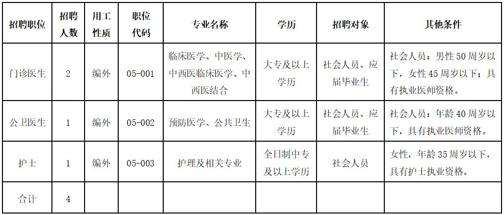 因工作需要,我镇社区卫生服务中心决定向社会公开招录4名编外工作人员,现将有关事项公告如下:
