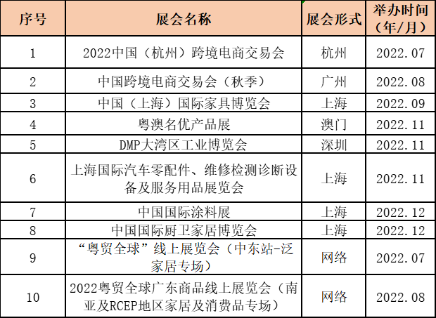 为鼓励企业积极参与国际市场竞争,促进对外贸易高质量发展,宣传顺德制造外贸区域品牌形象,根据我区产业特色、市场布局和企业需求,结合市级(或以上)商务部门、国家级行业商(协)会相关重点项目,顺德区经济促进局编制了2022年顺德区重点涉外展览计划(第二批)。参加重点计划内相关展会的企业,如符合条件,可申请各级资金。