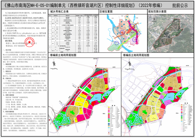 本次修编范围位于佛山市南海区西樵镇中部,北至樵丹路,南至官太路,东至樵园路,西至樵高路,总面积359.36公顷。