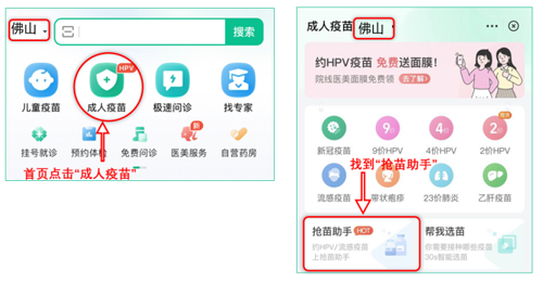2、下载后,选择“佛山”区,点击 “成人疫苗” ,点击“抢苗助手”。