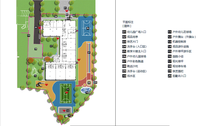 园内以红黄蓝多色块区分;体育运动区域和自然景观区域;使得幼儿享受运动快乐的同时;够贴近自然感受生态环境的美