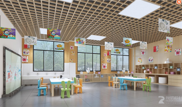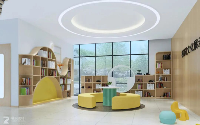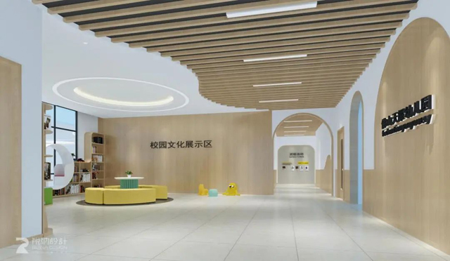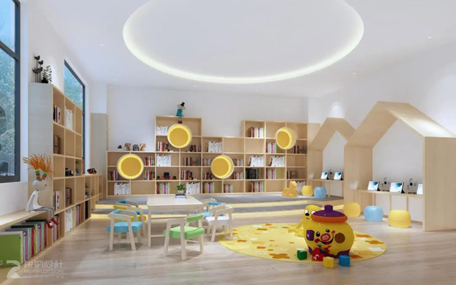 顶上的设计为圆形大吊顶整体灯光色彩柔和温馨;让孩子们也能静下心安静阅读;校园文化展示区域内配备圆桌圆椅与启智图书暖黄色与绿色相映衬;整个空间色彩自成一体宁静又不失活泼
