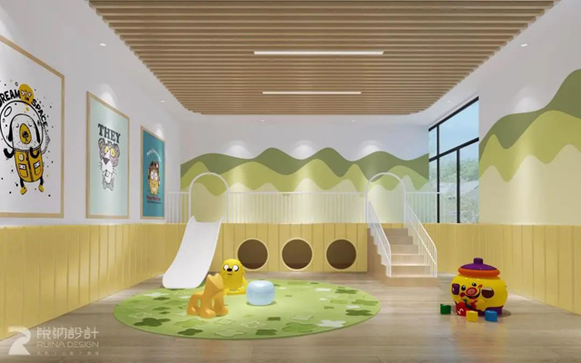 活动室内空间开阔以绿色山峰为主题将滑梯与攀岩等功能植入楼梯空间中;并设置有探索乐趣的躲藏洞营造出孩子们在山峦中探险;孩子能够尽情玩耍也能体验到空间场景化的趣味。