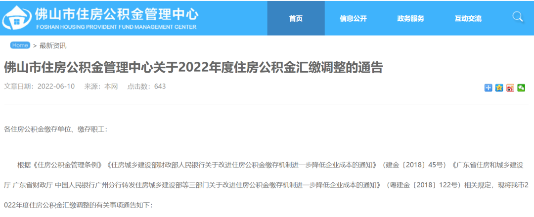 日前,佛山市住房公积金管理中心发布《关于2022年度住房公积金汇缴调整的通告》,就2022年度(2022年7月至2023年6月)佛山住房公积金缴存比例、缴存基数及缴存额进行通告。