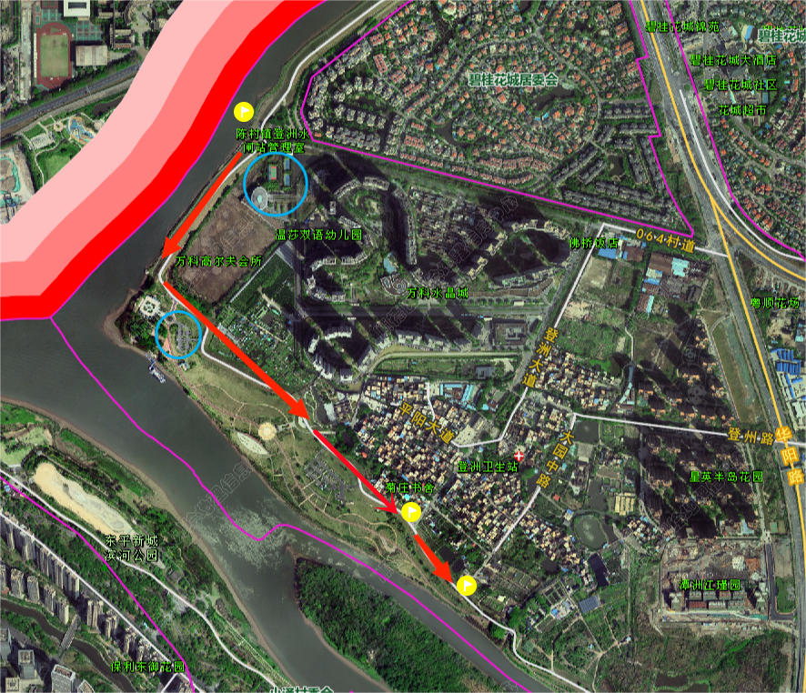 从2022年6月17日起,逢周六日、法定节假日的9:30至18:30,设定堤围路(陈村镇登洲水闸站管理室至大园中路)为管控区域,进入该管控区域的道路全程实施车辆单向路线行驶(如图红色箭头所示方向)。