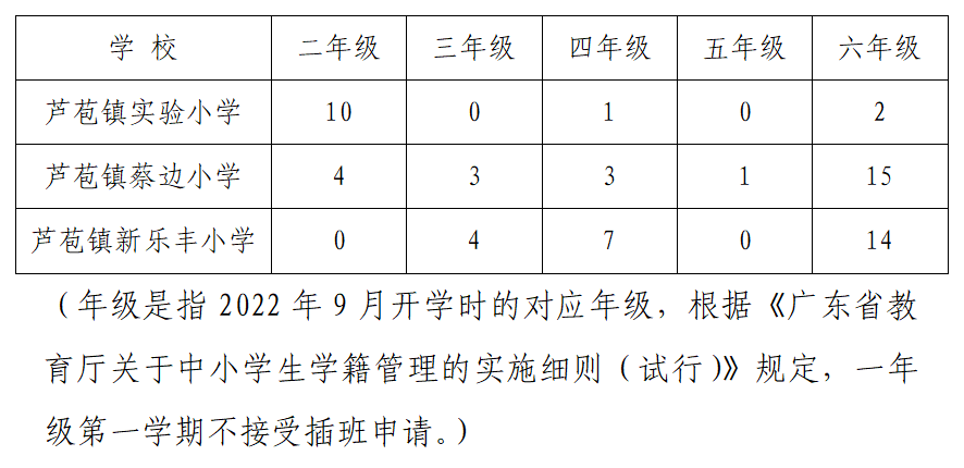 根据《三水区教育局关于进一步规范招生和学籍管理工作的通知》和《关于做好义务教育阶段转学插班工作的通知》的文件要求,我镇公办小学在2022年秋季招收二至六年级插班学生。现将各学校招收插班生学位数、报名条件及申请办理手续予以公布: