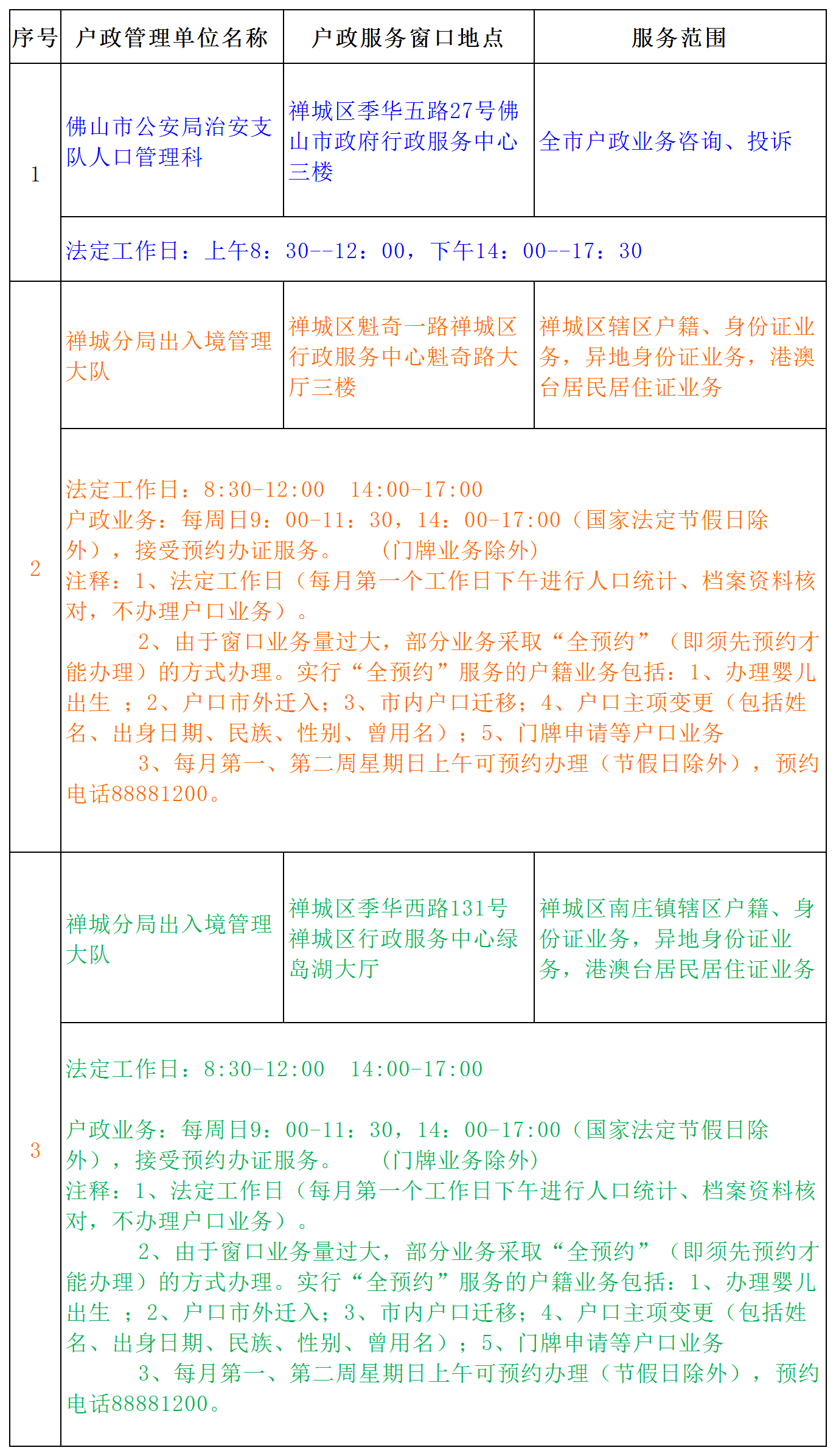 禅城区公安机关各级户政窗口地址及办公时间