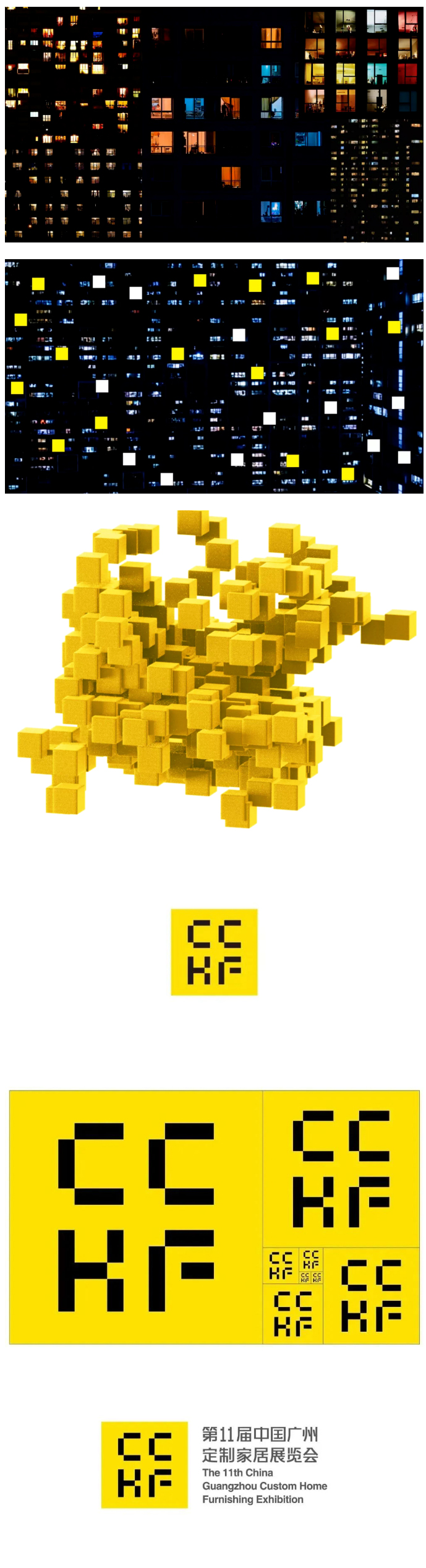 像素是构成信息的基本单位,家是定制家居企业服务的基本单元,万家灯火的幸福正是定制家居行业的价值所在。由此概念逐渐演化出广州定制家居展英文缩写CCHF的字体形态,像素化的呈现代表着定制家居行业智能化、数字化的特点。在更高的层面,它与在信息社会中成长起来的新一代消费者的特征契合,呼应元宇宙这个正在生成中的数字社会。