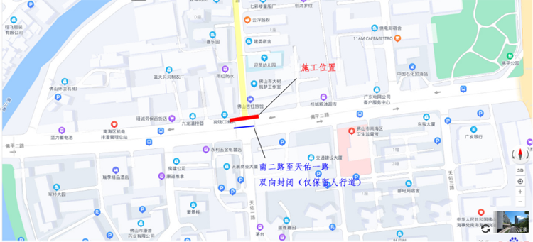 1、本阶段施工位置位于佛平路接南二路路口,届时南二路至天佑一路双向封闭(仅保留人行道);