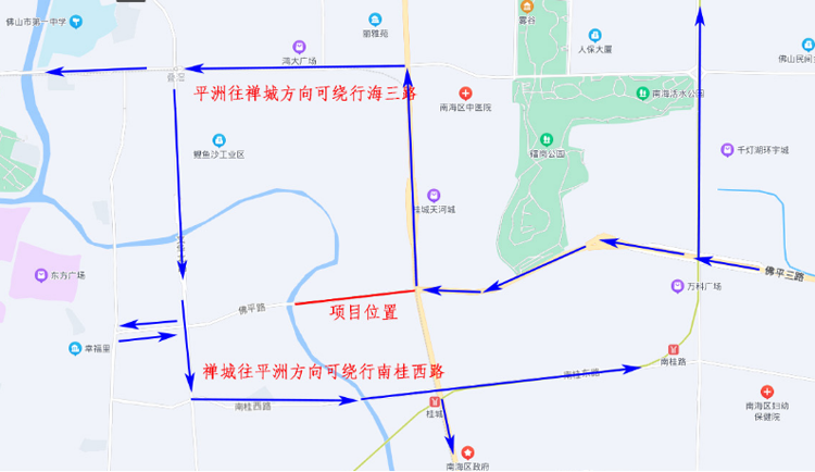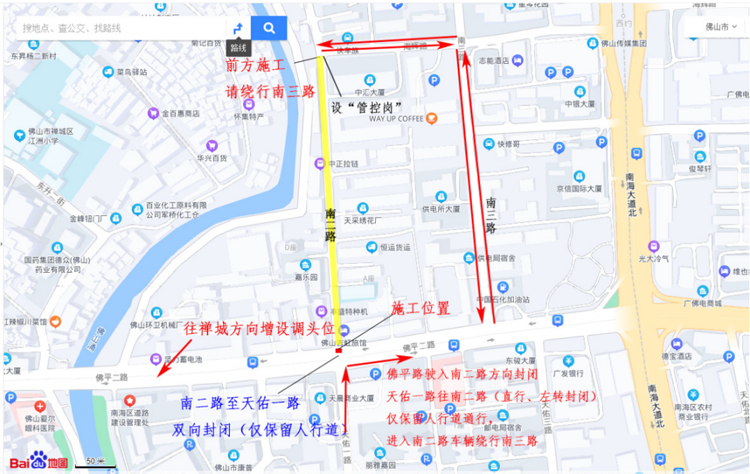 3、佛平路往南二路方向封闭,需绕行至南三路进入;