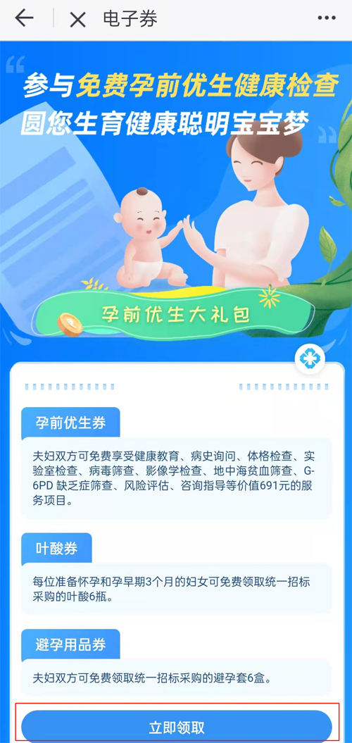 领取孕优电子券同时,可领取孕优大礼包一份,包括叶酸领取券(每位妇女可领取统一招标采购的叶酸6瓶)、基本避孕药具领取券(夫妇双方可免费领取统一招标采购的避孕套6盒)各一张。