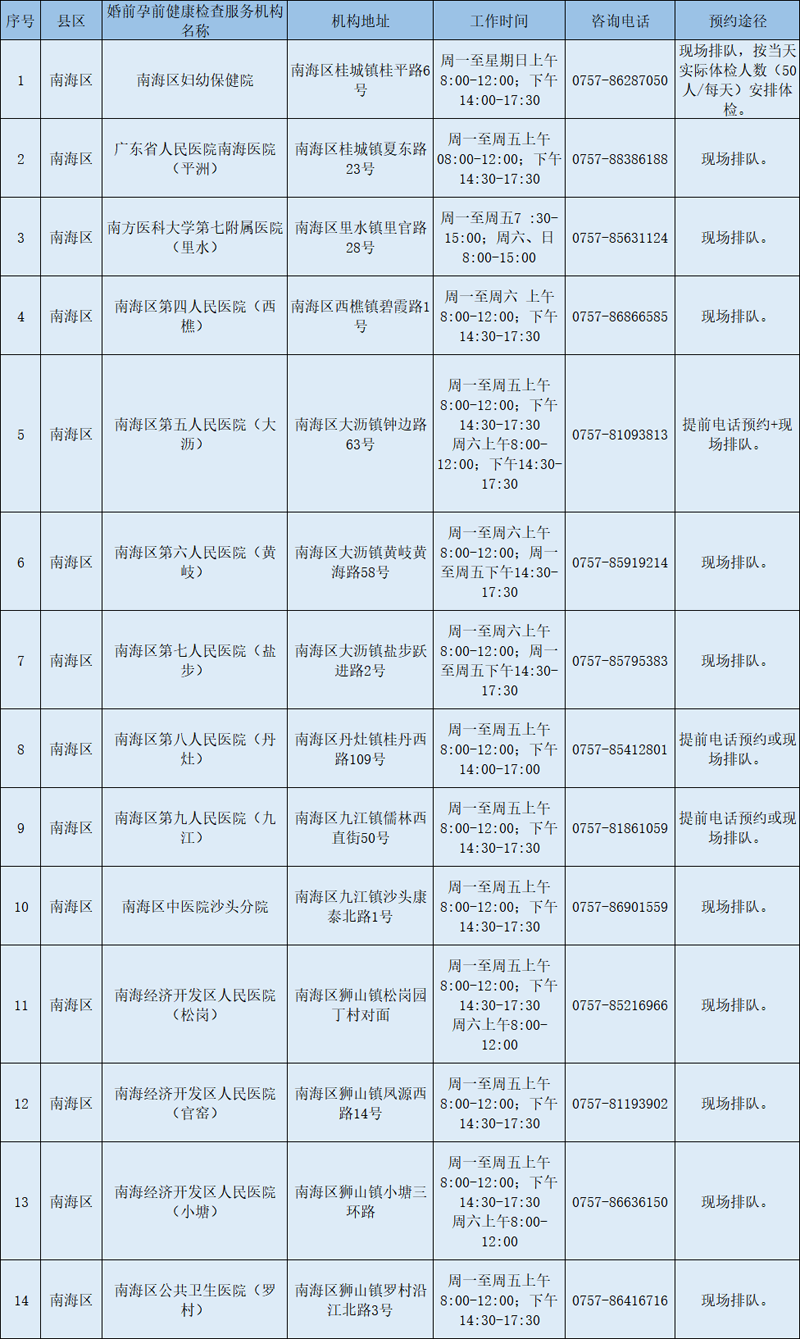 免费孕前优生健康检查人群为一方或双方为广东省户籍或持有效《广东省居住证》的在南海居住的新婚夫妇或再生育夫妇,可在预约结婚登记后至怀孕3个月内,享受一次免费婚前孕前健康检查;符合再生育政策的,按规定每孩次可继续享受一次免费孕前优生健康检查服务。