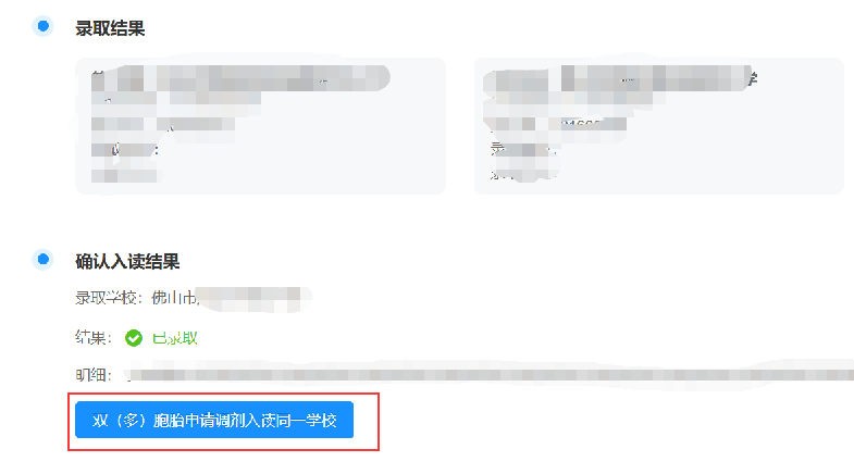 报名所属区和所报志愿一致的同胞孪生兄弟姐妹未全部被同一学校录取的,注册前可向其中被自动确认录取的志愿靠前学校所在区教育行政部门申请调剂入读同一学校,报名所属区或所报志愿(含志愿顺序)不一致的,不接受调剂。