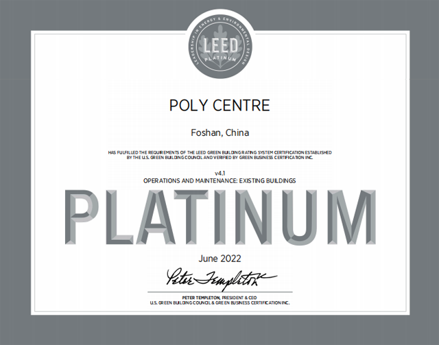 2022年6月,佛山新城保利中心成功获得美国绿色建筑评估标准体系LEED v4.1 O+M:EB (既有建筑运营与维护) 铂金级认证!这一认证不仅代表着国际绿色评级体系中最高级别的认证荣誉,更是成为佛山首个LEED EB v4.1 铂金级认证项目。