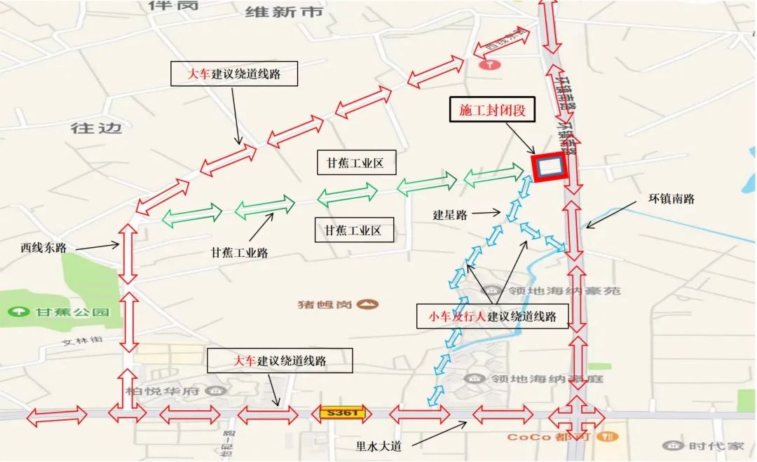 小车及行人进出甘蕉工业区及周边区域则建议可通过西线东路⇔甘蕉工业路⇔建星路⇔环镇南路线路进行绕道通行。