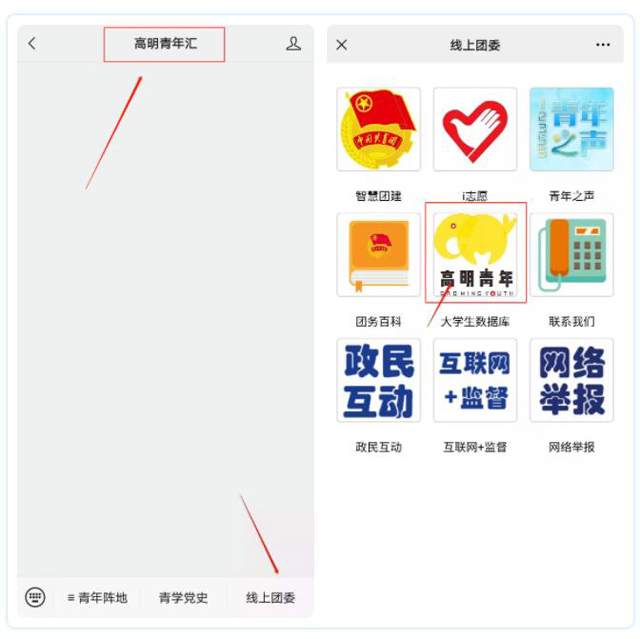 进入“高明青年汇”公众号——点击右下角“线上团委”——大学生数据库。
