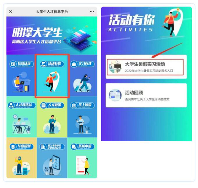 点击活动有你栏目——找到“大学生暑假实习活动”入口,点击进入报名。